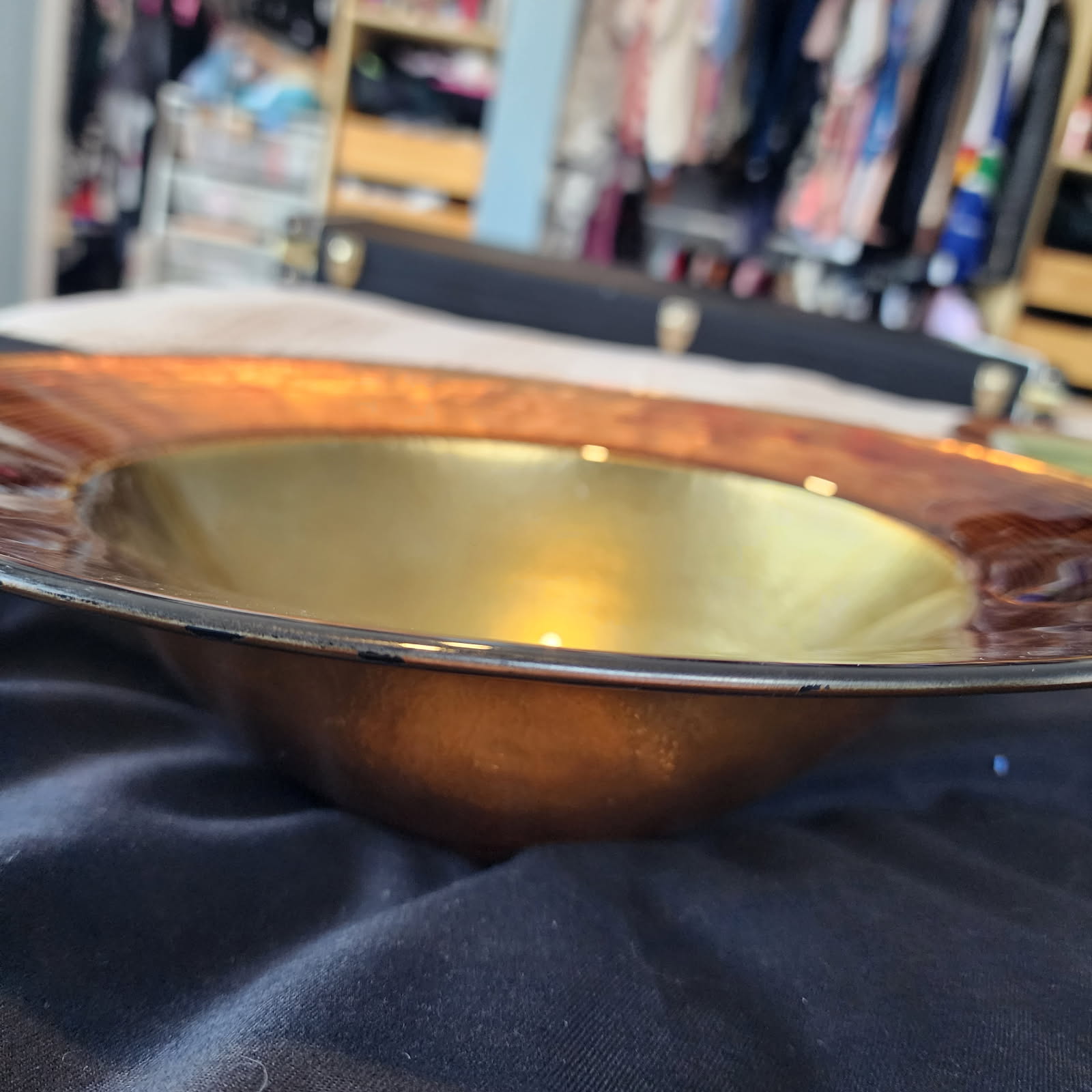 Make a statement with this stunning large decorative bowl featuring a rich amber and burnt copper exterior with a radiant gold-toned glass interior. The textured ribbed rim adds depth and visual interest, catching light beautifully from every angle.