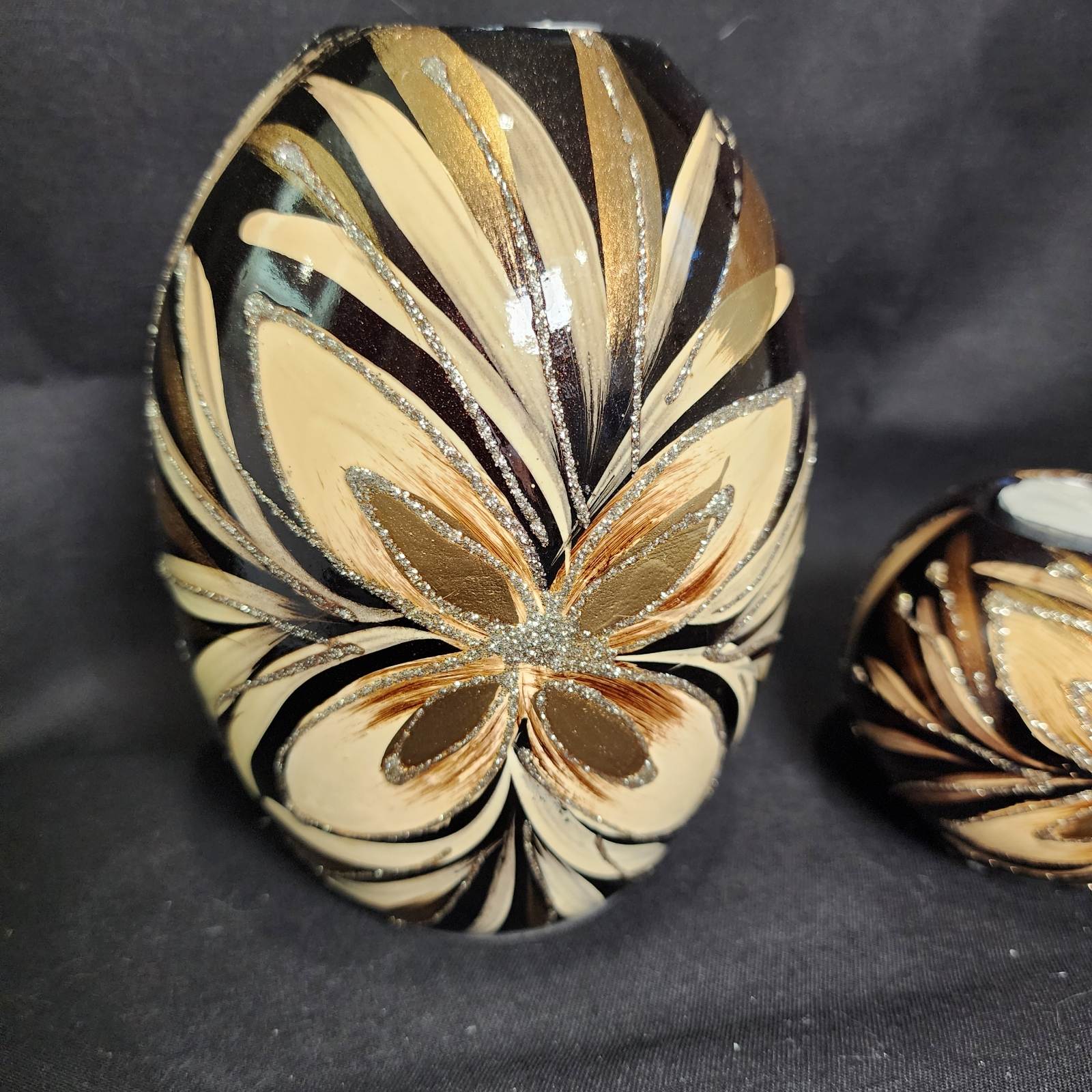 Turn any space into something extraordinary with this glamorous matching candle holder set. Featuring a dramatic hand-painted floral burst design in cream, gold, and bronze against a deep black gloss background — all outlined in sparkling silver glitter. Absolutely show-stopping in candlelight.